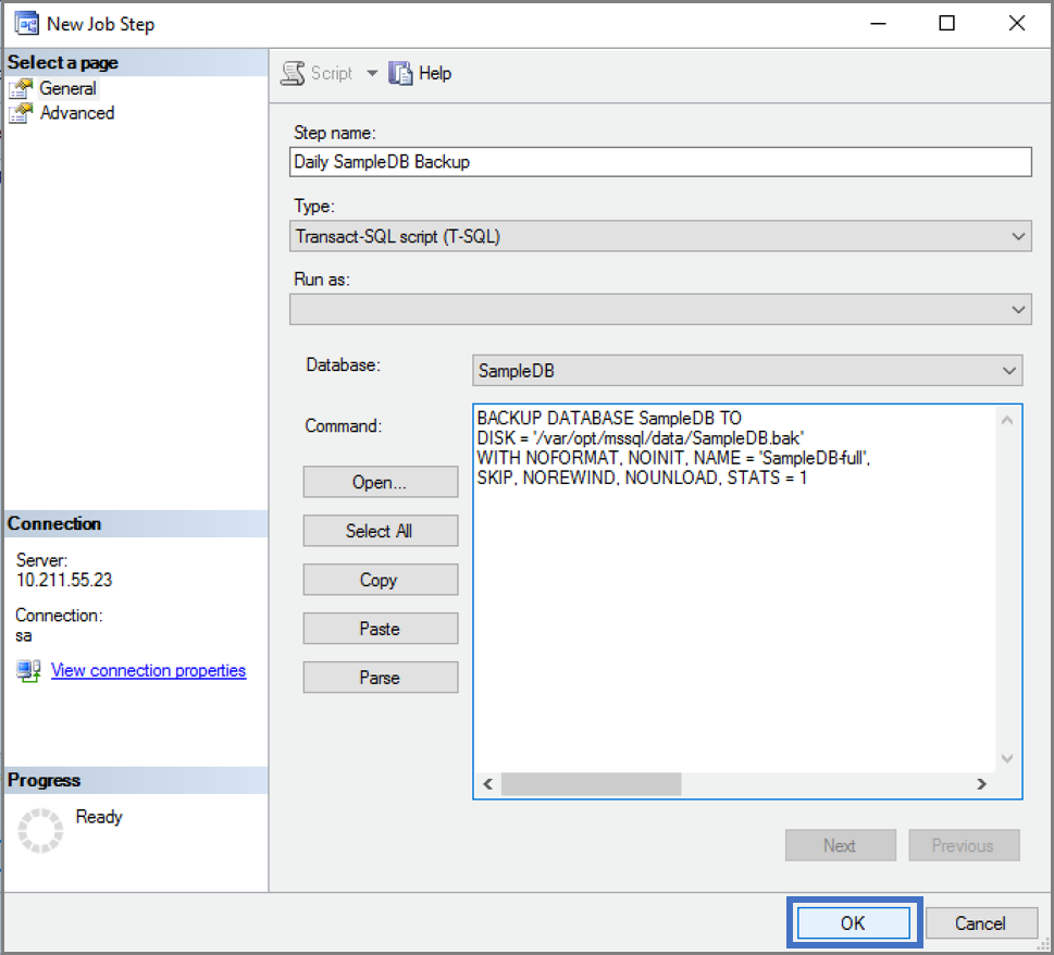SampleDB.EXECUTE sp_add_jobstep @job_name = N'Daily SampleDB Backup', @step_name = N'Backup database', @subsystem = N'TSQL', @command = N'BACKUP DATABASE SampleDB TO DISK = \ N''/var/opt/mssql/data/SampleDB.bak'' WITH NOFORMAT, NOINIT, \ NAME = ''SampleDB-full'', SKIP, NOREWIND, NOUNLOAD, STATS = 10', @retry_attempts = 5, @retry_interval = 5; GOEm seguida, crie um agendamento diário para seu trabalho com sp_add_schedule.