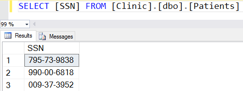 Supondo que SSN seja uma coluna criptografada char(11) na tabela Patients, a consulta mostrada abaixo retornará valores de texto sem formatação, se o Always Encrypted estiver habilitado para a conexão de banco de dados e se você tiver acesso à chave mestra de coluna configurada para a coluna SSN.