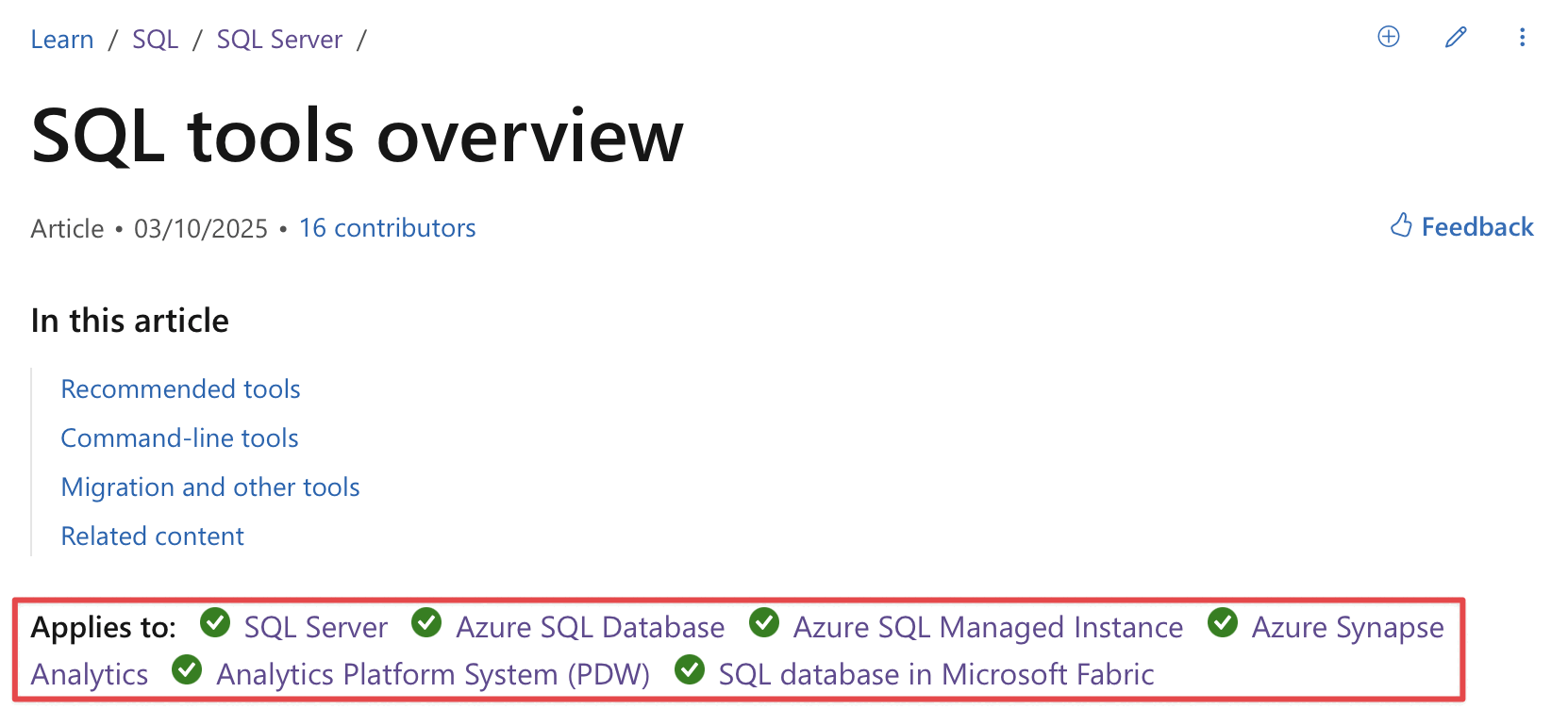 Cada artigo do SQL Server contém um arquivo include applies-to após o título. Isso indica a quais áreas ou versões do SQL Server o artigo se aplica.