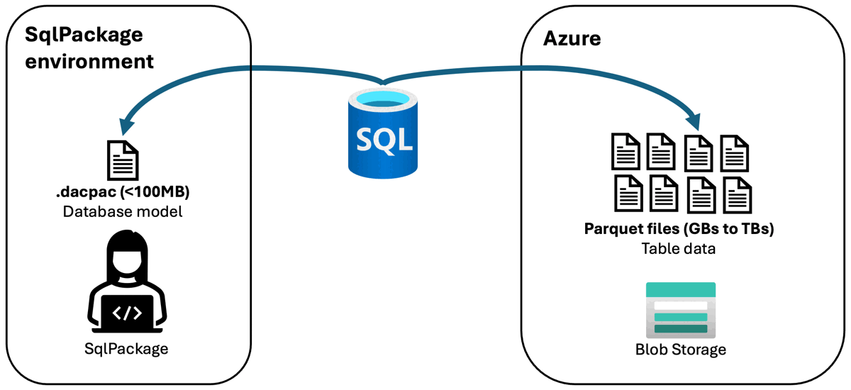 Com publish, o esquema de banco de dados (arquivo .dacpac) é lido do cliente local que executa o SqlPackage, e os dados são lidos ou gravados no Armazenamento de Blobs do Azure no formato Parquet.