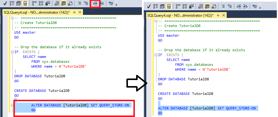 USE master; GO --Drop the database if it already exists IF EXISTS (SELECT name FROM sys.databases WHERE name = N'TutorialDB') DROP DATABASE TutorialDB; GO CREATE DATABASE TutorialDB; GO ALTER DATABASE [TutorialDB] SET QUERY_STORE = ON; GORealce a parte Alterar Database do texto e selecione o botão Comentar na barra de ferramentas: