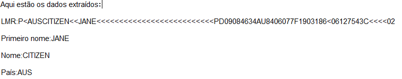 Corpo — esse campo deve conter a Zona Legível por Máquina, o nome, o sobrenome e o país/região extraídos do documento.