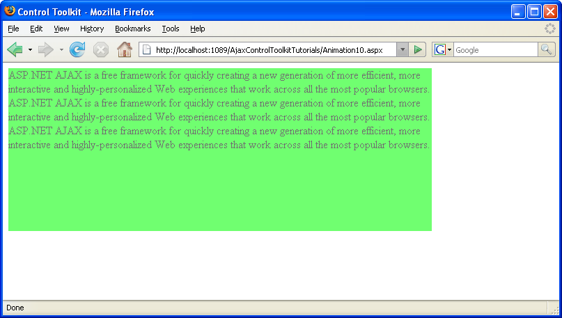 O controle Animação no kit de ferramentas de controle ASP.NET AJAX não é apenas um controle, mas uma estrutura inteira para adicionar animações a um controle. A execução da animação também pode ser disparada usando código JavaScript personalizado do lado do cliente.
