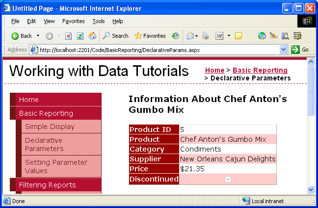 Ao visitar esta página, o controlo de dados Web invocará o método Select do ObjectDataSource, que chamará o método ProductsBLL da classe GetProductByProductID(productID) usando o valor fixo de 5 como parâmetro de entrada productID. O método retornará um objeto fortemente tipado ProductDataTable que contém uma única linha com informações sobre o Gumbo Mix do Chef Anton (o produto com ProductID 5).