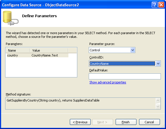 Como o GetSuppliersByCountry(country) método tem um parâmetro de entrada, o assistente mais uma vez inclui uma tela final para escolher o valor do parâmetro. Desta vez, defina a origem do parâmetro como Control. Isso preencherá a lista pendente ControlID com os nomes dos controles na página; escolha, na lista, o controle CountryName. Quando a página é visitada pela primeira vez a CountryName TextBox estará em branco, portanto, nenhum resultado é retornado e nada é exibido. Se você quiser exibir alguns resultados por padrão, defina a caixa de texto DefaultValue de acordo.