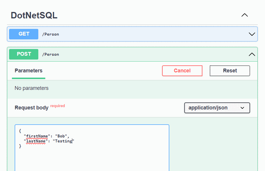GETmétodo na página da interface do usuário do Swagger e selecione Experimentar. Selecione Executare a pessoa que você acabou de criar será retornada.