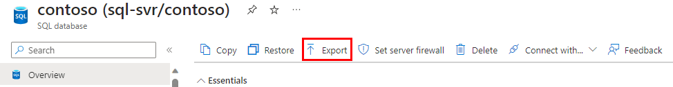 Para exportar um banco de dados usando o portal do Azure, abra a página do seu banco de dados e selecione Exportar na barra de ferramentas.
