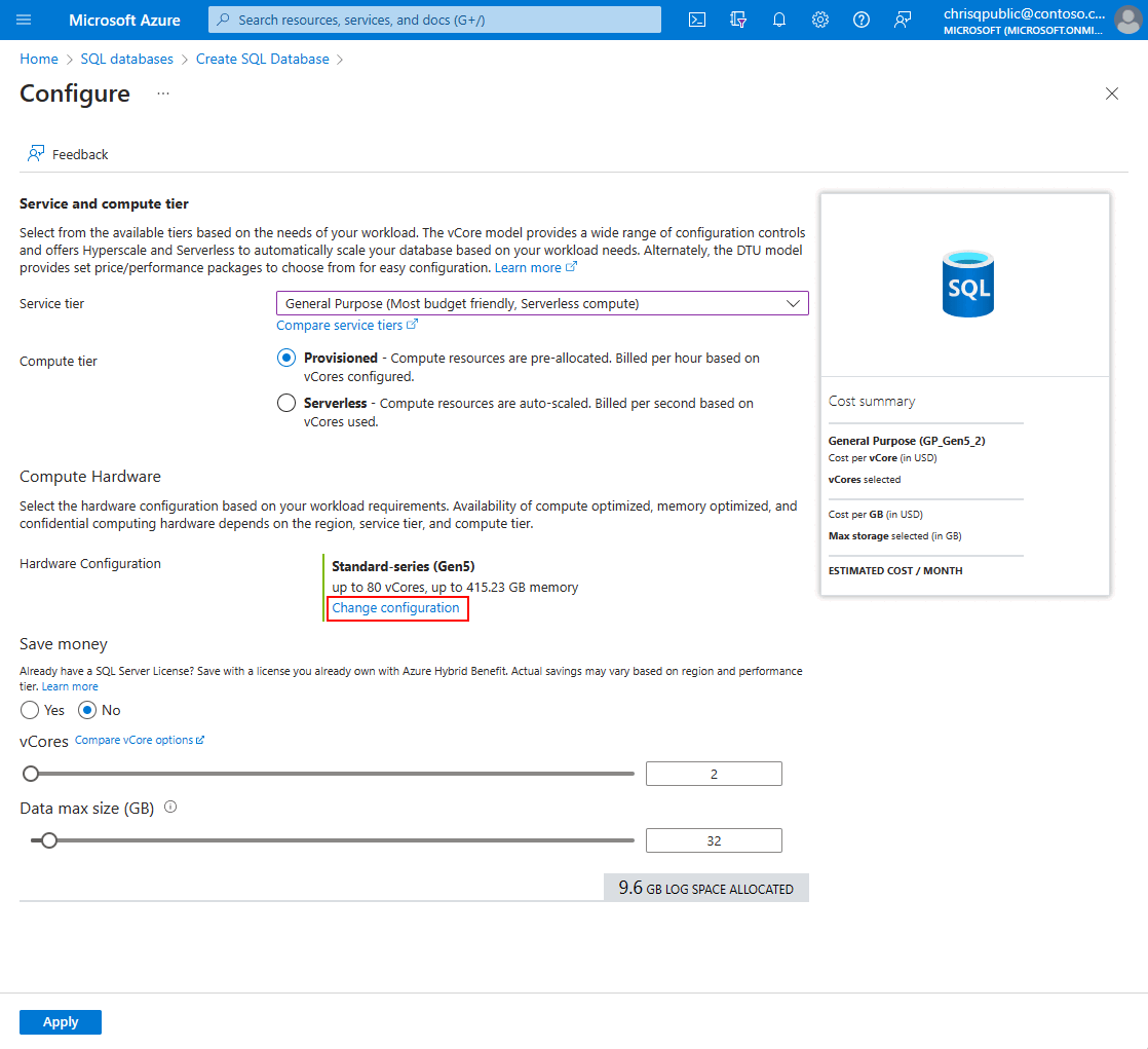 Na guia Noções básicas, selecione o link Configurar banco de dados na seção Computação + armazenamento, e depois selecione o link Alterar configuração: