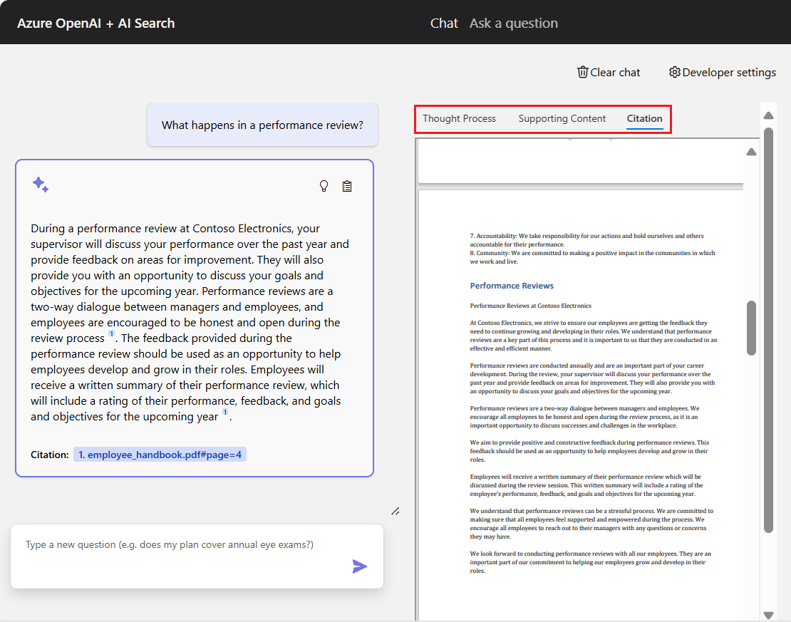 Sem o classificador semântico: "Durante uma avaliação de desempenho na Contoso Electronics, seu supervisor discutirá seu desempenho no ano passado e fornecerá feedback sobre as áreas a serem melhoradas. É um diálogo bidirecional onde você é encorajado a ser honesto e aberto (1). O feedback fornecido durante a avaliação deve ser positivo e construtivo, com o objetivo de ajudá-lo a se desenvolver e crescer em sua função. Você receberá um resumo por escrito da avaliação, incluindo uma avaliação de seu desempenho, feedback e metas para o próximo ano (1)."