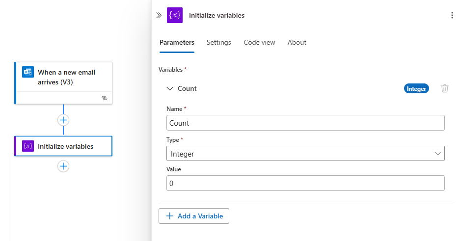 Adicione a ação Inicializar variáveis para criar uma variável inteira chamada Count que tenha um valor inicial definido como 0.
