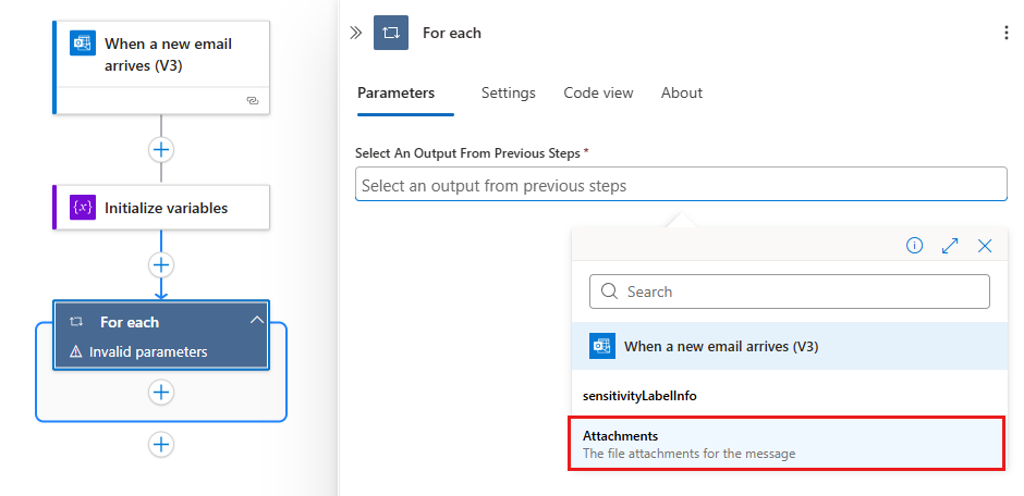 A propriedade Attachments passa uma matriz que contém os anexos de email da saída do gatilho para o loop para que seu fluxo de trabalho seja iterado.