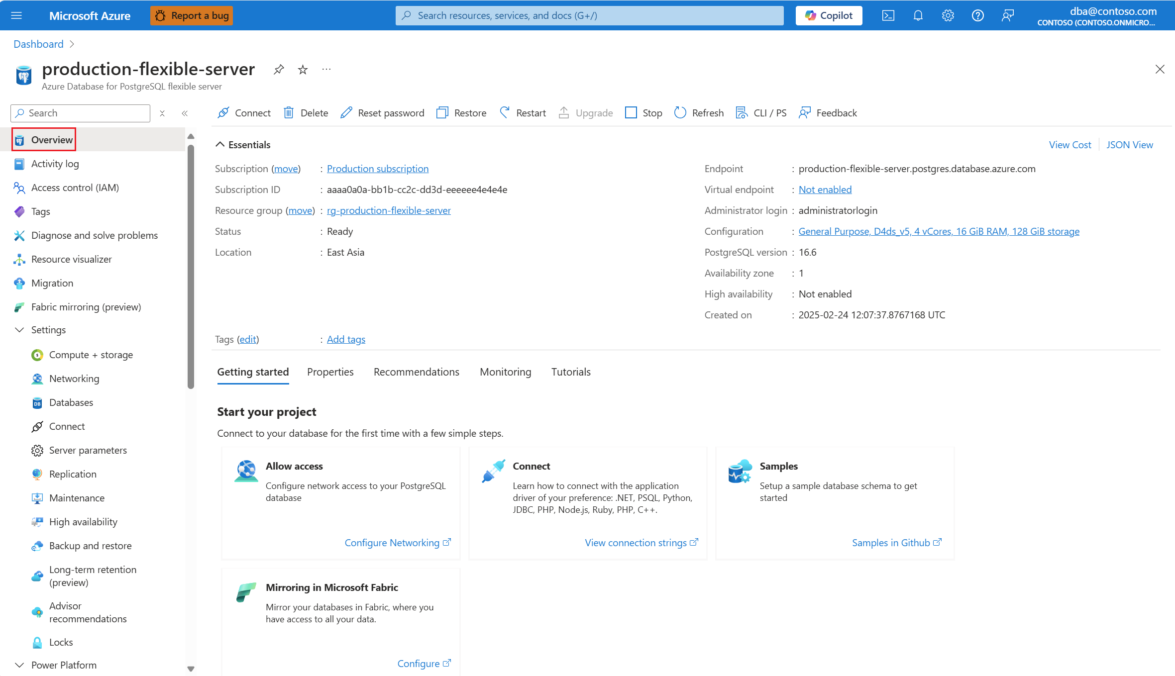 - Na página Visão geral do servidor, copie o nome do servidor totalmente qualificado. O nome do servidor totalmente qualificado é sempre do formato <my-server-name.postgres.database.azure.com>.