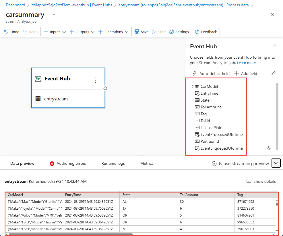 Em poucos segundos, você verá dados de entrada de exemplo e o esquema. Você pode optar por soltar campos, renomear campos ou alterar o tipo de dados, se desejar.