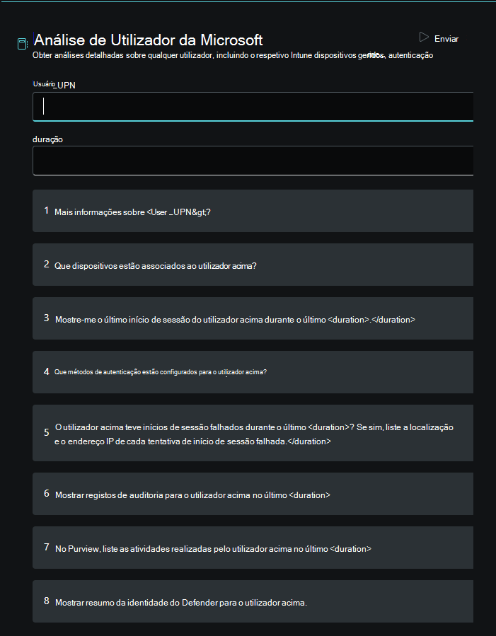 O promptbook de análise do Utilizador microsoft pode ser utilizado por um Administração de TI para analisar e obter informações detalhadas sobre um utilizador e dispositivos associados em vários produtos do Microsoft 365. Isto inclui dados de início de sessão e autenticação de Microsoft Entra ID, informações do dispositivo de Intune, detalhes de atividade invulgares do Microsoft Purview e um resumo Microsoft Defender que realça deteções importantes.
