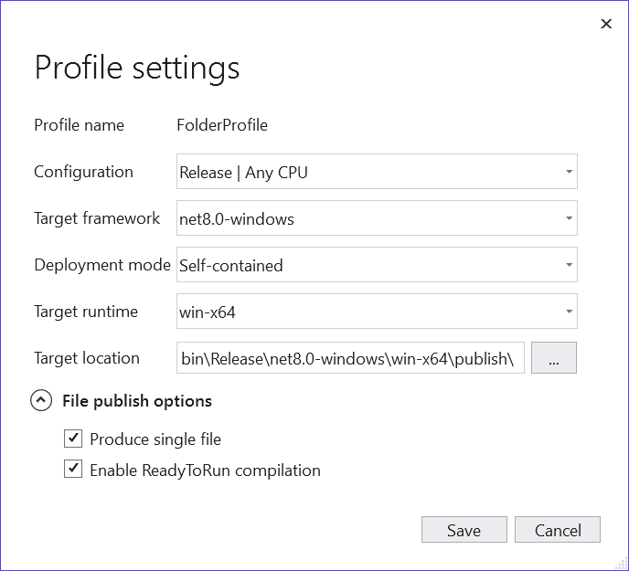 Para publicar o aplicativo do Visual Studio, você pode criar um perfil de publicação persistente. O perfil de publicação é baseado em XML e tem a extensão de arquivo .pubxml. O Visual Studio usa esse perfil para publicar o aplicativo implicitamente, enquanto se você estiver usando a CLI do .NET, deverá especificar explicitamente o perfil de publicação para que ele seja usado.