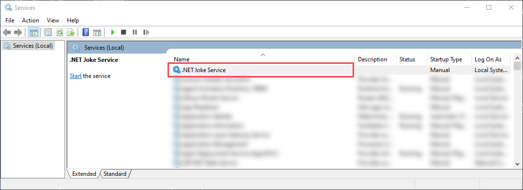 Depois de ver os logs no Log de Eventos , deve interromper o serviço. Ele foi projetado para registrar uma piada aleatória uma vez por minuto. Este é um comportamento intencional, mas não é prático para serviços de produção.