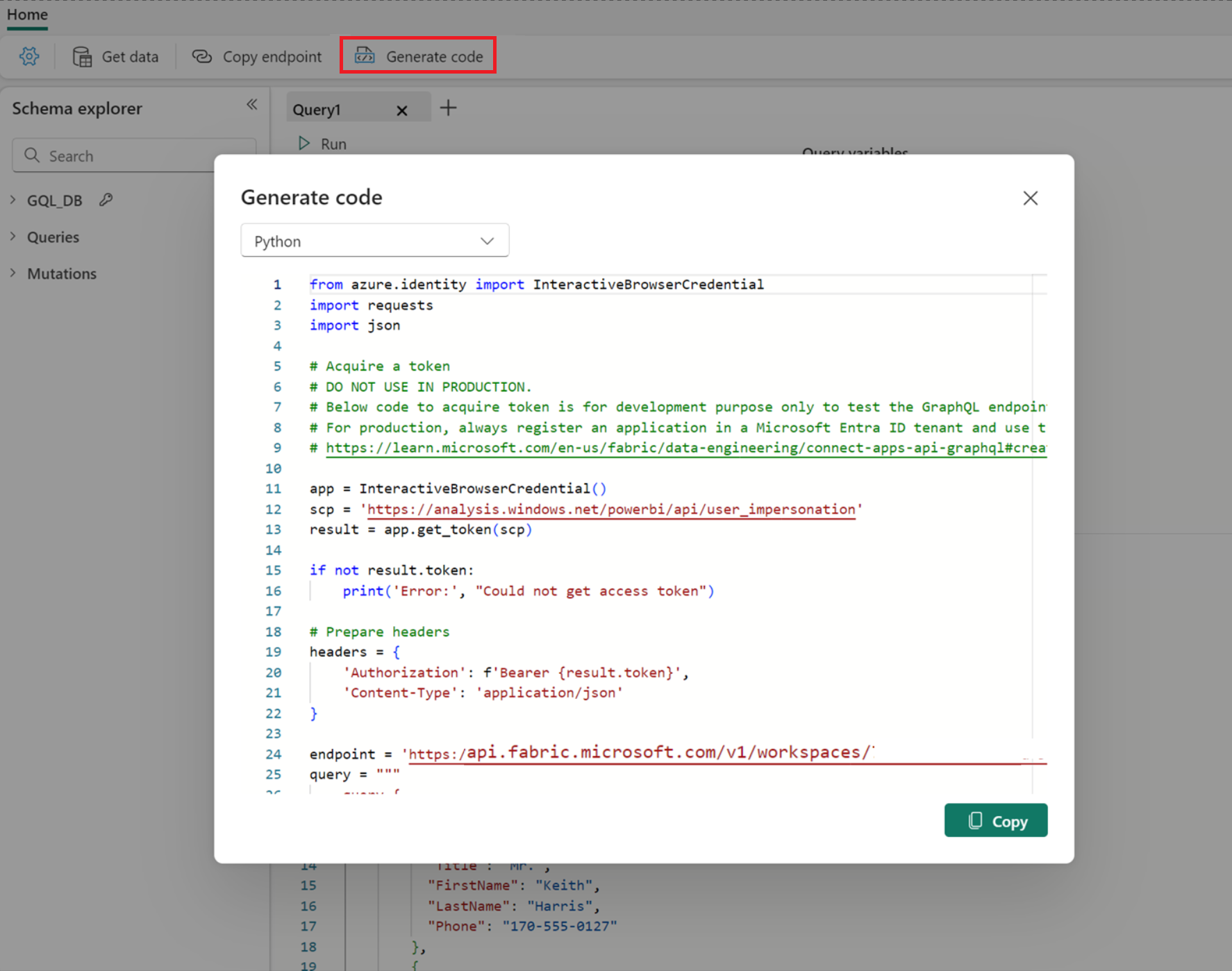 O código gerado usa credenciais interativas do navegador e deve ser usado apenas para fins de teste. Na produção, sempre cadastre um aplicativo no Microsoft Entra e utilize os escopos e escopos apropriados client_id . Você pode encontrar um exemplo de ponta a ponta com código de exemplo em Connect Applications.