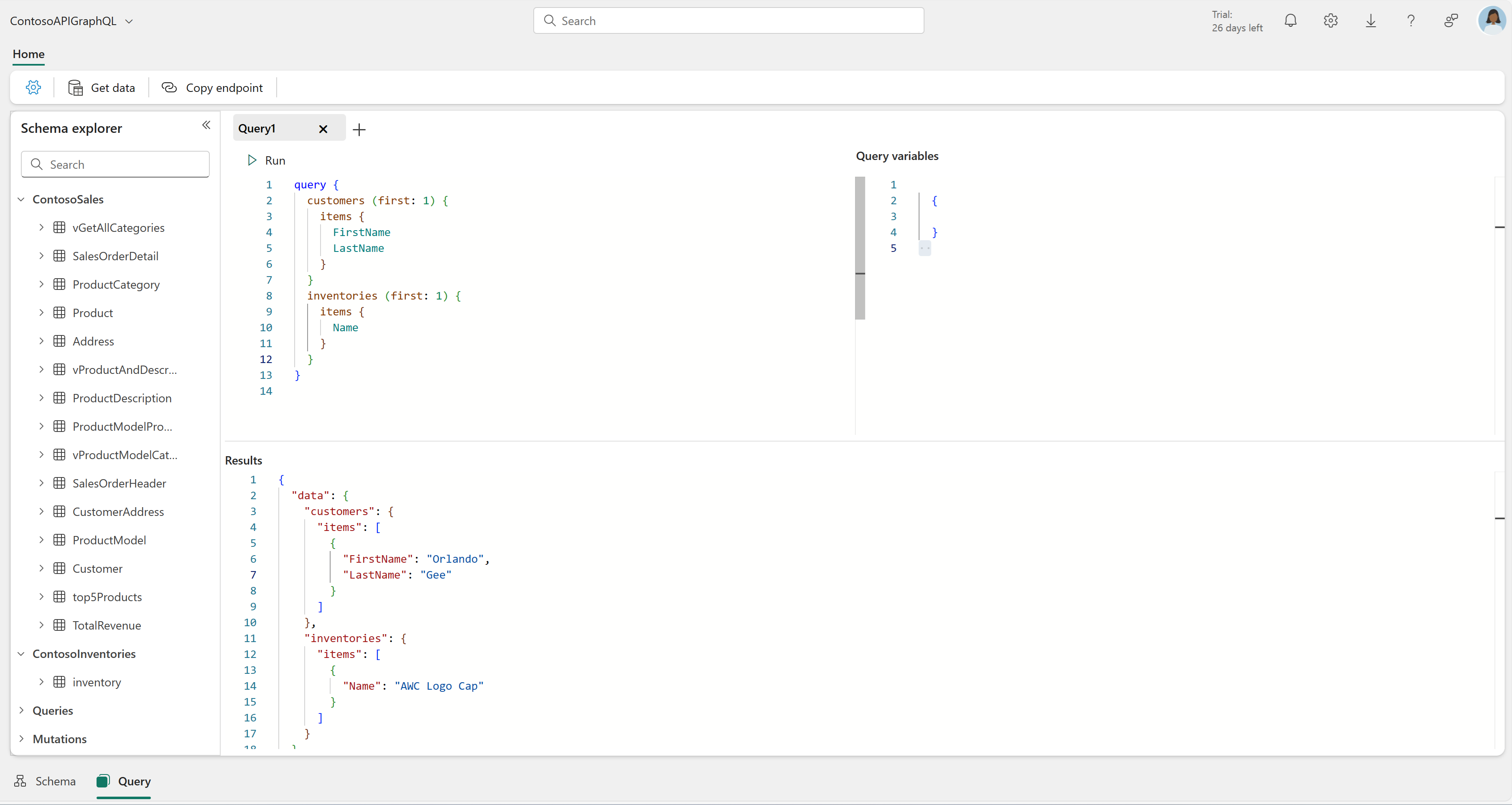 Essa solicitação recupera o primeiro nó da consulta de clientes derivada da fonte de dados ContosoSales e o primeiro nó da consulta de inventários derivada da fonte de dados ContosoInventory .
