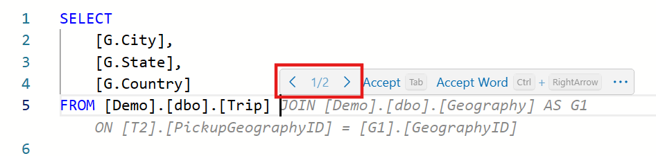 A completação de código melhora a sua produtividade e o seu fluxo de trabalho no banco de dados SQL do Copilot in Fabric, reduzindo a carga cognitiva de escrever código em T-SQL. Ele acelera a escrita de código, evita erros de sintaxe e erros de digitação e melhora a qualidade do código. Ele fornece sugestões úteis e ricas em contexto diretamente no editor de consultas. Seja você novo ou experiente com T-SQL, a complementação de código ajuda a poupar tempo e energia na escrita do código e a concentrar-se na conceção, otimização e teste da sua base de dados.