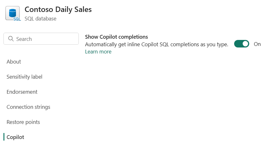 Verifique se a configuração Mostrar conclusões do Copilot está ativada nas configurações do seu banco de dados.