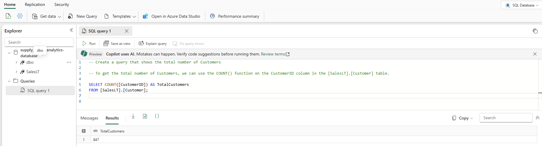 Em um ambiente de produção, você pode ter dados que já estão em um formato normalizado para operações diárias de aplicativos, que você simulou aqui com os dados SalesLT . À medida que você cria uma consulta, ela é salva automaticamente no item Consultas no painel Explorer. Você deve ver sua consulta como "Consulta SQL 1". Por padrão, o sistema numera as consultas como "Consulta SQL 1", mas você pode selecionar as reticências ao lado do nome da consulta para duplicar, renomear ou excluir a consulta.