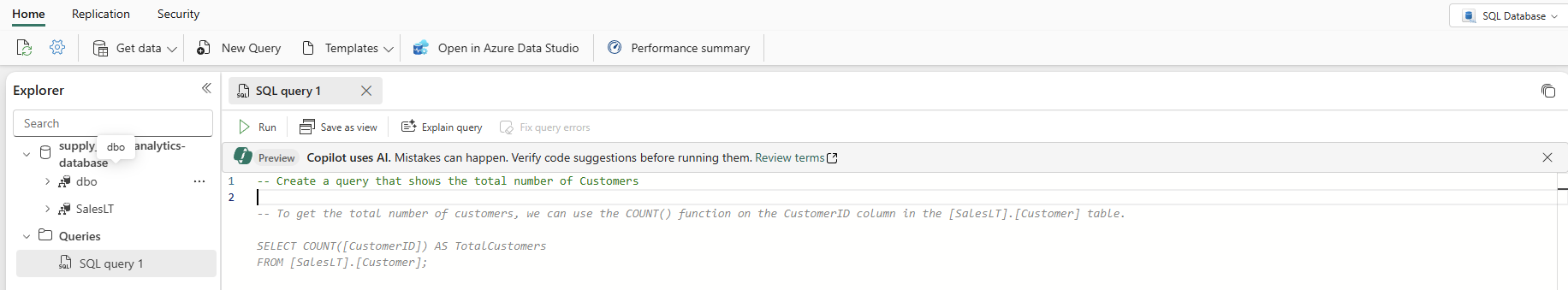 Na visualização do banco de dados, comece selecionando Nova Consulta na barra de ícones. Isso traz um editor de consultas, que tem o recurso Copilot AI para ajudá-lo a escrever seu código. O Copilot para banco de dados SQL pode ajudá-lo a concluir uma consulta ou criar uma.