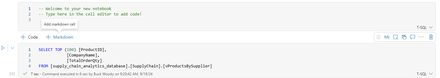 Isso cria uma célula com código T-SQL que tem as instruções pré-preenchidas para você. Selecione o botão Executar célula para que a célula execute a consulta e retorne os resultados.