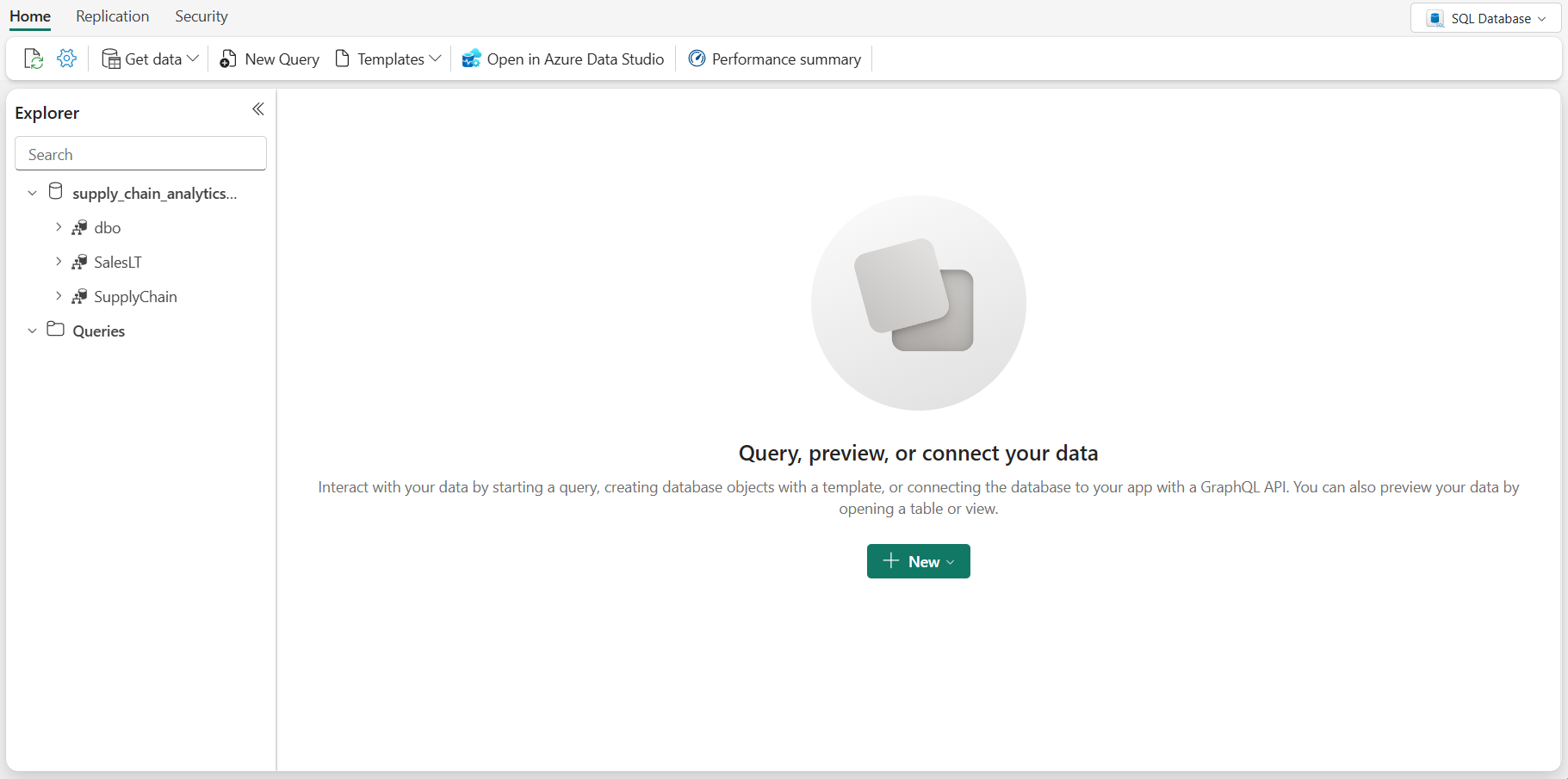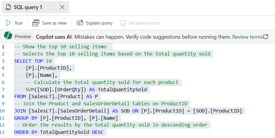 TOP 10e cria uma exibição com base em uma consulta T-SQL analítica simples. O novo modo de exibiçãoSupplyChain.vProductsbySuppliersserá usado posteriormente neste tutorial.-- Show the top 10 selling items SELECT TOP 10 [P].[ProductID], [P].[Name], SUM([SOD].[OrderQty]) AS TotalQuantitySold FROM [SalesLT].[Product] AS P INNER JOIN [SalesLT].[SalesOrderDetail] AS SOD ON [P].[ProductID] = [SOD].[ProductID] GROUP BY [P].[ProductID], [P].[Name] ORDER BY TotalQuantitySold DESC; GO /* Create View that will be used in the SQL GraphQL Endpoint */ CREATE VIEW SupplyChain.vProductsbySuppliers AS SELECT COUNT(a.ProductID) AS ProductCount , a.SupplierLocationID , b.CompanyName FROM SupplyChain.Warehouse AS a INNER JOIN dbo.Suppliers AS b ON a.SupplierID = b.SupplierID GROUP BY a.SupplierLocationID, b.CompanyName; GOSelecione o botão Executar na barra de ferramentas para executar a consulta T-SQL.