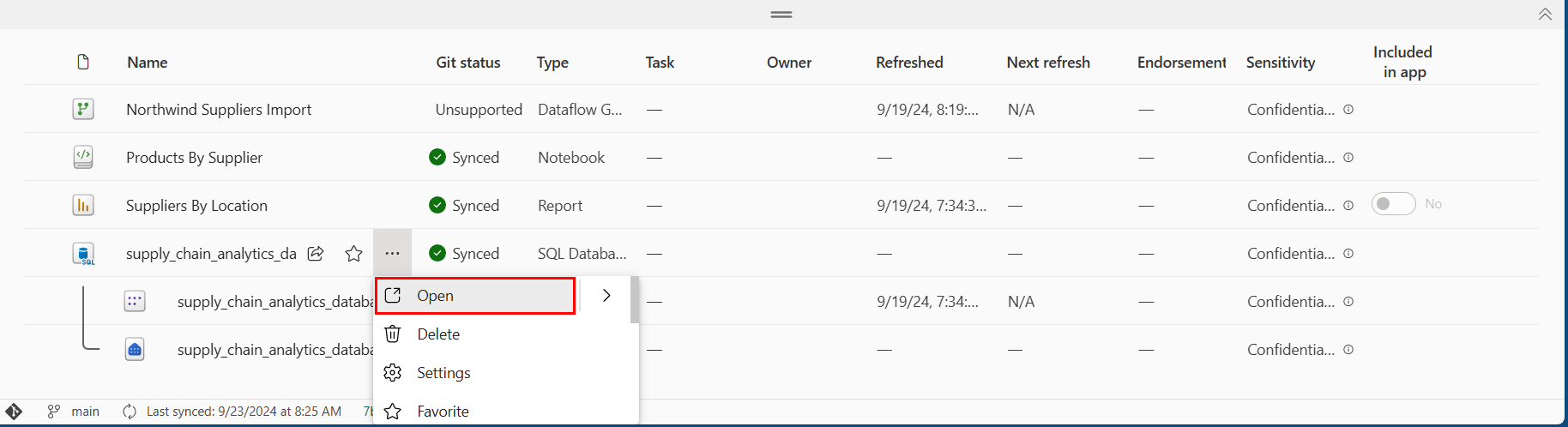 Abra seu espaço de trabalho e localize o banco de dados SQL no Fabric que você criou anteriormente neste tutorial. Selecione o nome do banco de dados ou selecione as reticências ao lado do nome do banco de dados e selecione Abrir.