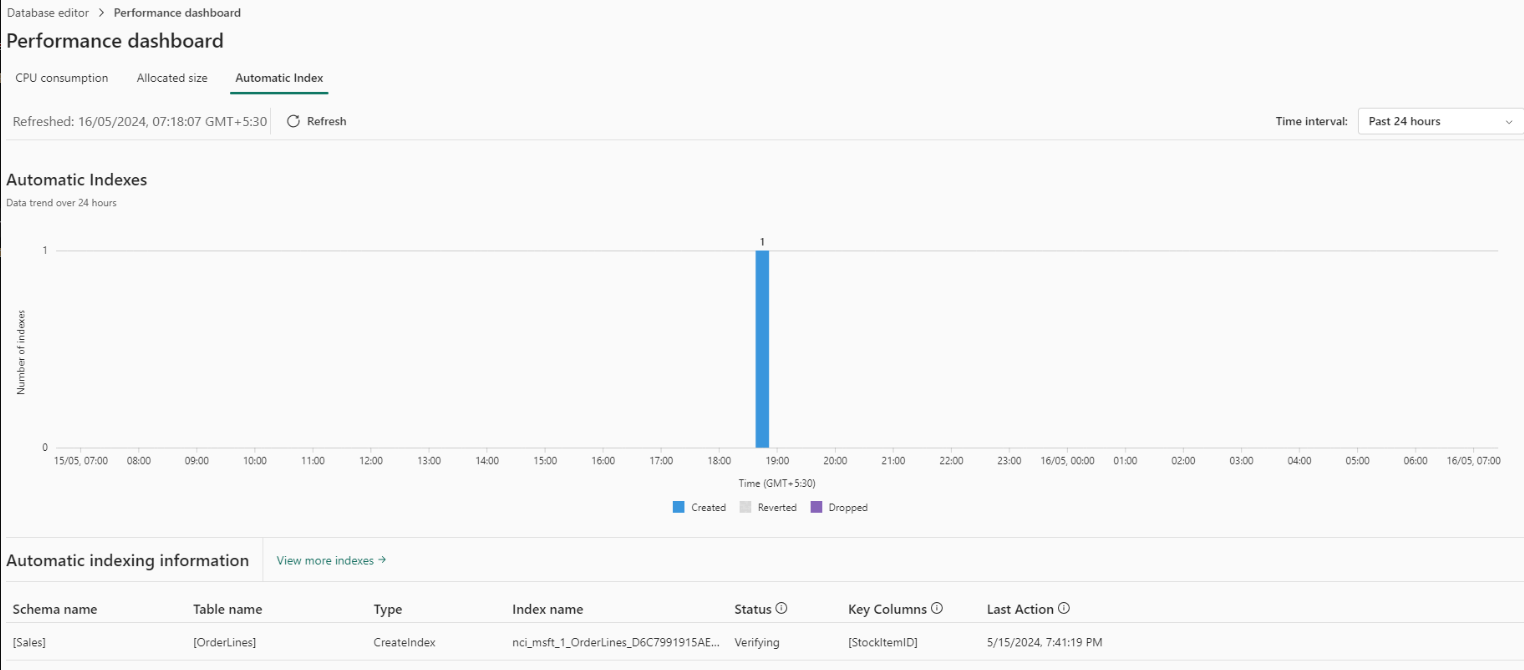 No portal de malha, a guia Índice automático mostra um histórico e o status dos índices criados automaticamente: