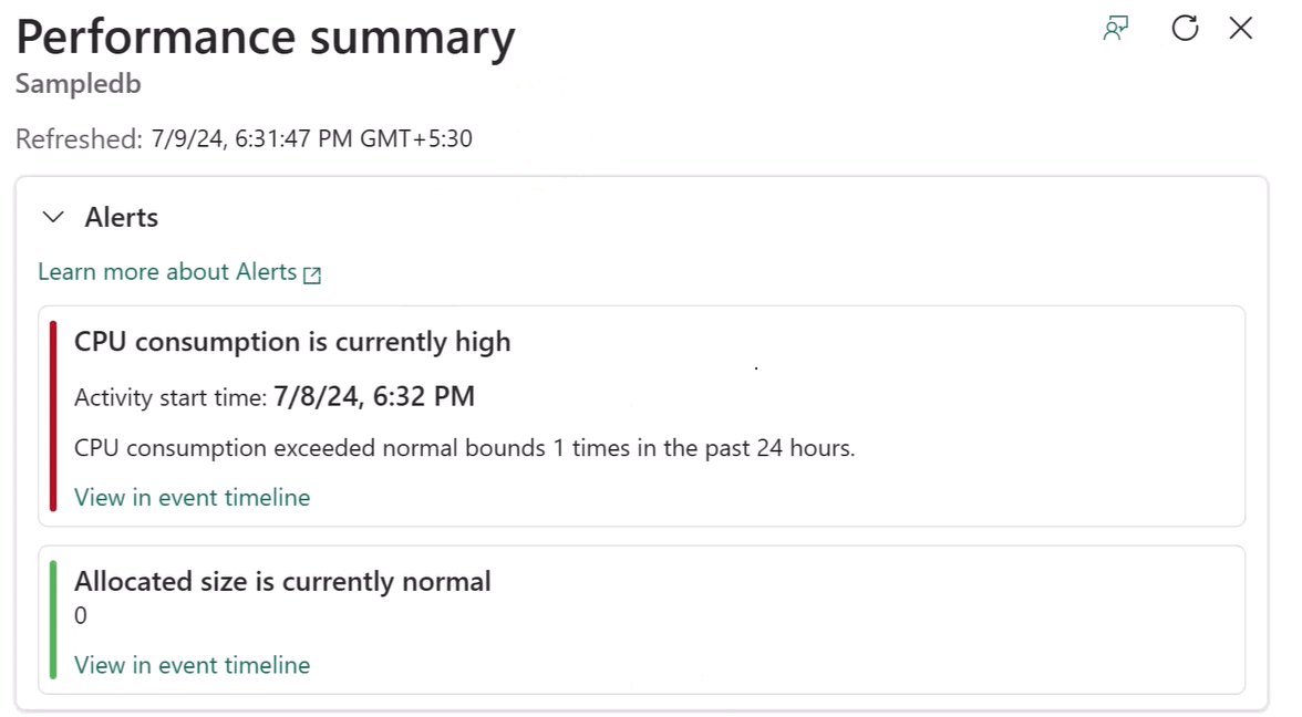 Depois de selecionar o link para um alerta, o Resumo de Desempenho fornece um resumo dos alertas e métricas recentes do banco de dados. A partir daqui, você pode detalhar a linha do tempo do evento para obter mais informações.