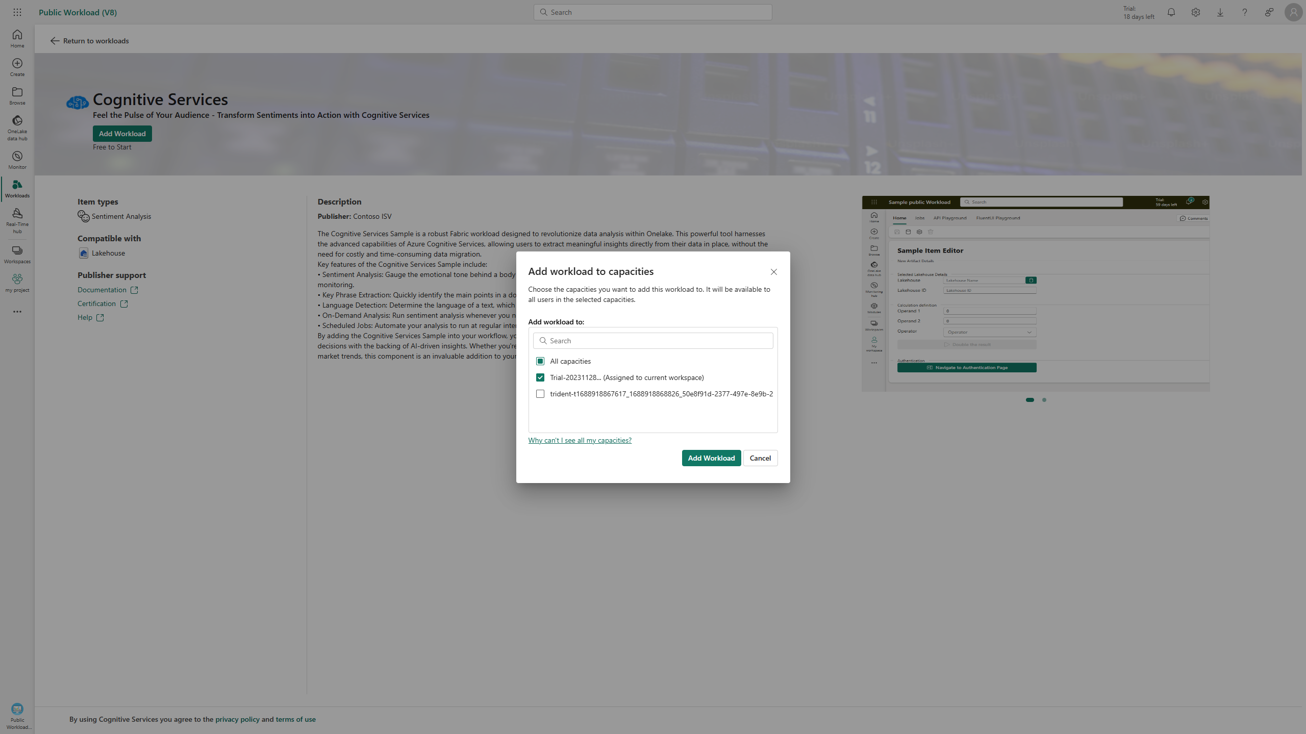 Agora, a carga de trabalho está disponível em todos os espaços de trabalho aos quais a capacidade selecionada é atribuída. Somente espaços de trabalho que têm essa capacidade atribuída podem criar esse item de carga de trabalho.