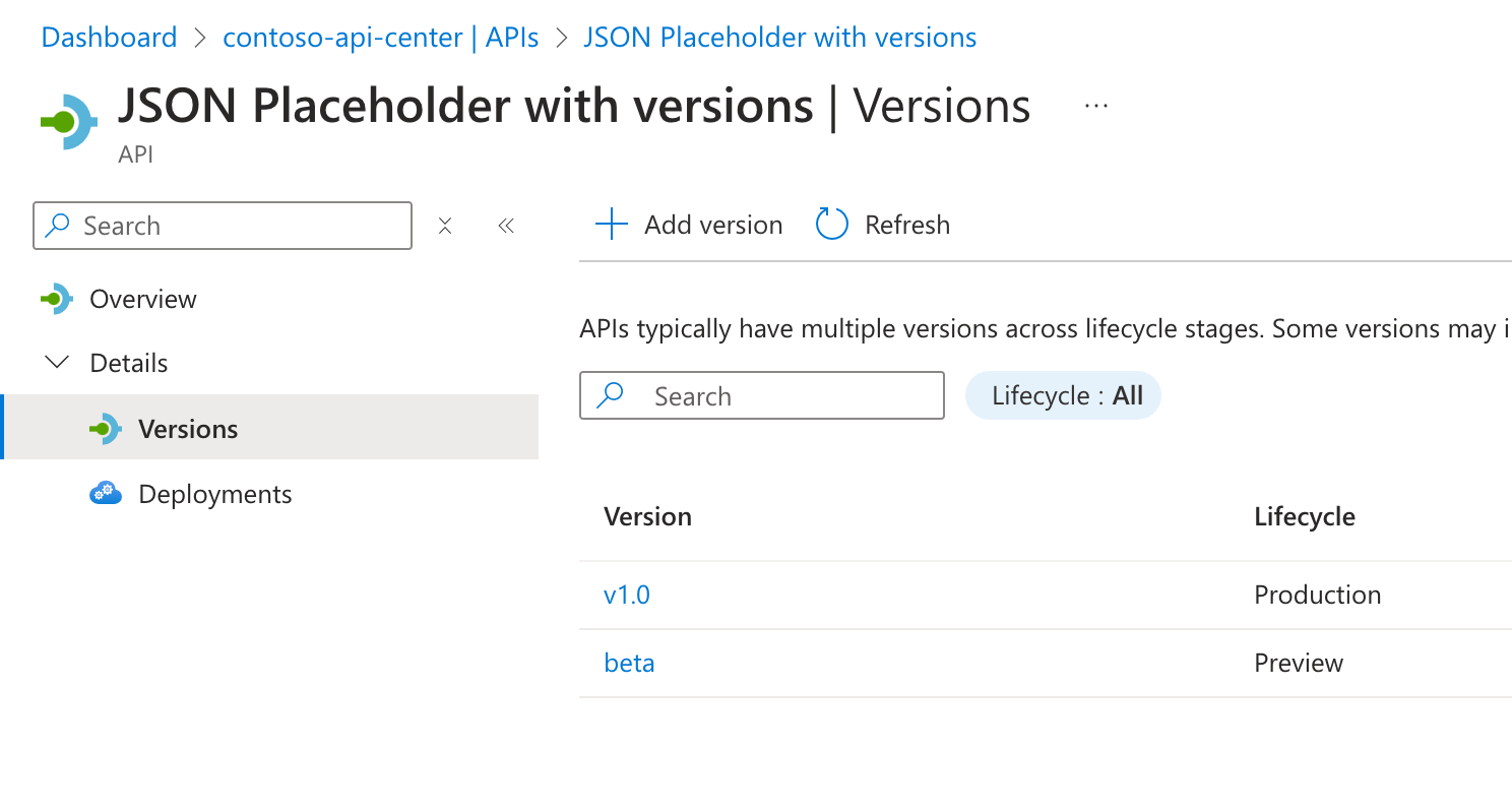 Antes de começar, crie uma instância do Centro de API do Azure e registre as APIs que você usa em sua organização. Para cada API, defina as versões que você usa e especifique seu estágio de ciclo de vida.