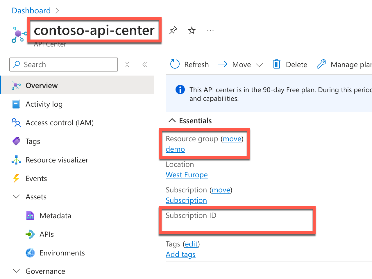 Na página Visão geral da instância do Centro de API do Azure, copie o nome da instância da Central de APIs, o nome do grupo de recursos e a ID da assinatura. Você precisa dessas informações para configurar o ApiCenterProductionVersionPlugin para que ele possa se conectar à sua instância do Centro de API do Azure.
