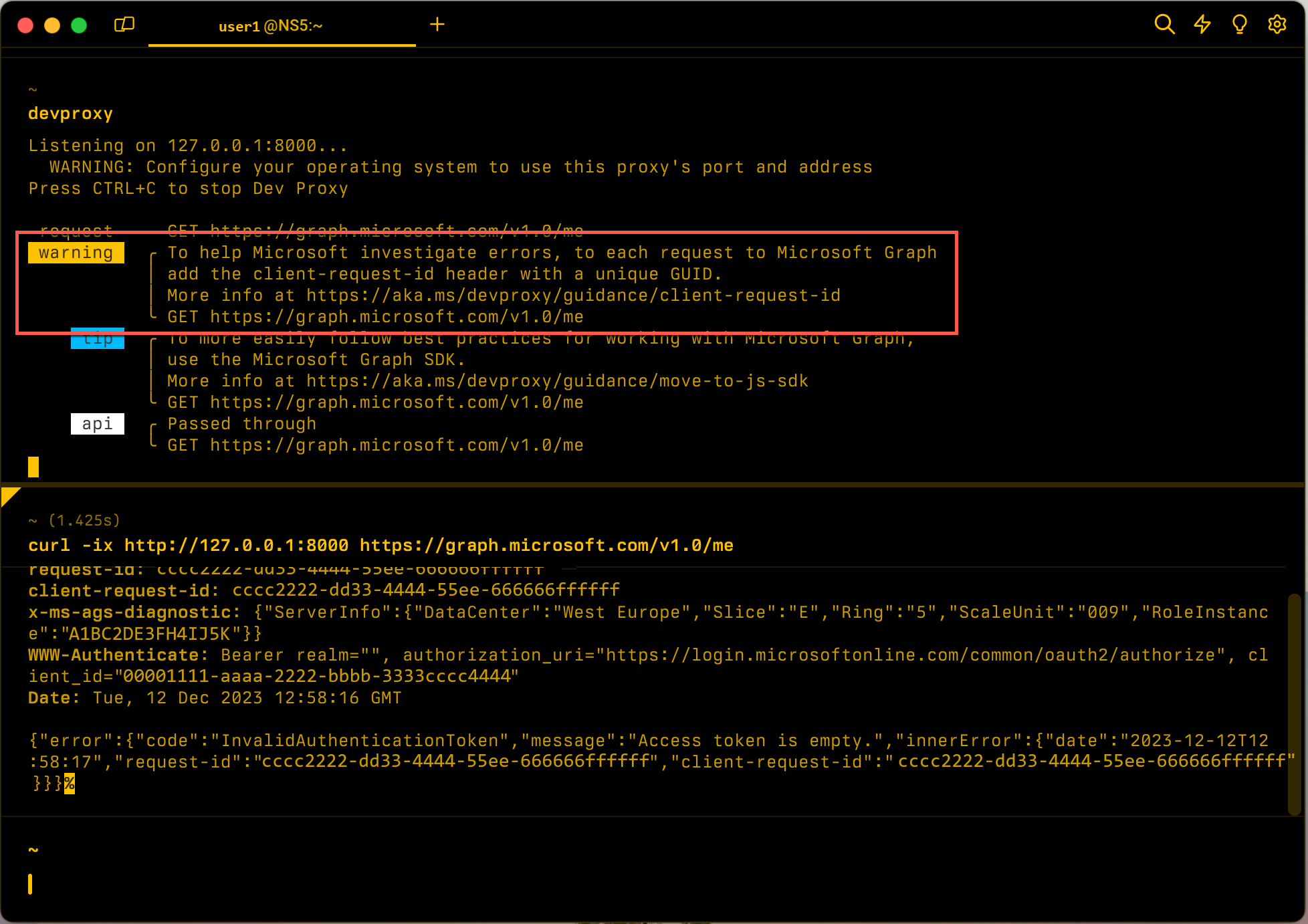 Mostra uma dica quando uma solicitação à API do Microsoft Graph não inclui o cabeçalho client-request-id.