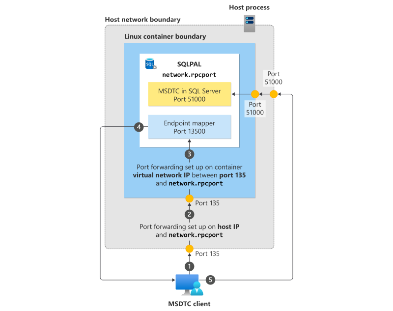 - O cliente MSDTC faz uma conexão diretamente com o MSDTC conectando-se ao host na porta 51000, que é encaminhado para o SQL Server dentro do contêiner.
