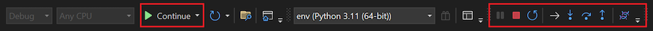 Enquanto o Depurador estiver em execução, percorra o código com F10ou execute o código a partir de cada ponto de interrupção com F5. Você também pode usar controles de depuração na barra de ferramentas principal no Visual Studio, como as opções de Continuar, Parar, Reiniciare Etapa: