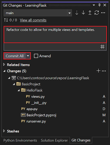 Na janela Git Changes, insira uma mensagem de confirmação e selecione Confirmar tudo: