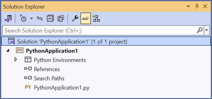 Os projetos são sempre gerenciados em uma solução Visual Studio. Uma solução pode conter qualquer número de projetos que podem fazer referência uns aos outros, como um projeto Python que faz referência a um projeto C++ que implementa um módulo de extensão. Com essa relação, o Visual Studio cria automaticamente o projeto C++ (se necessário) quando você começa a depurar o projeto Python. Para obter mais informações, consulte Soluções e projetos no Visual Studio.