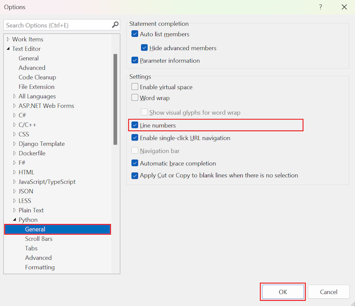 Por padrão, os números das linhas não aparecem no editor. Para ver os números das linhas, selecione Opções de Ferramentas>, expanda a secção Editor de >Geral de Python> e selecione a opção Números de linha: