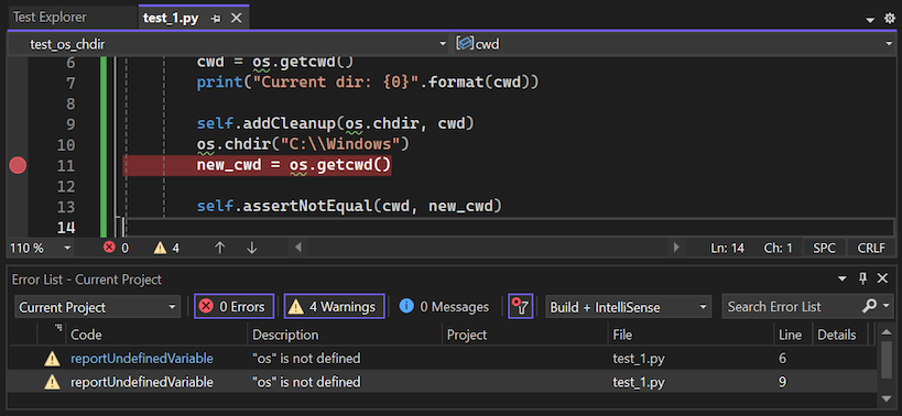 Python utiliza extensivamente testes unitários para validar cenários durante o desenho de um programa. O suporte a Python no Visual Studio inclui descobrir, executar e depurar testes unitários no contexto do seu processo de desenvolvimento, sem necessidade de executar testes separadamente.